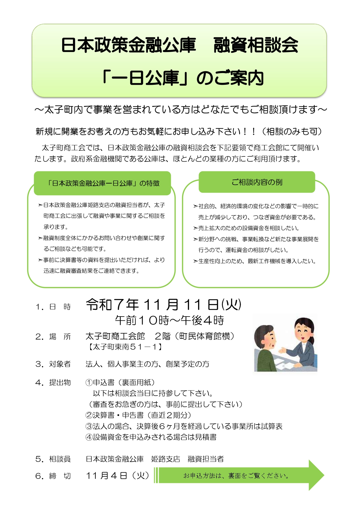 サイトマップ太子町商工会は、太子町の商工業の総合的改善発達をはかり、 社会一般の福祉の増進に資する事を目的として、 法律に基づき設立された「特別認可法人」です。